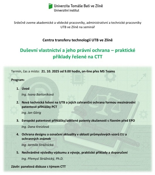 Pozvánka na seminář CTT 21.10.2025 – Duševní vlastnictví a jeho právní ochrana – praktické příklady řešené na CTT Posted on 6.10.2025 by ctt Seminář CTT – Duševní vlastnictví a jeho právní ochrana – praktické příklady řešené na CTT | Schůzka – připojit se | Microsoft Teams